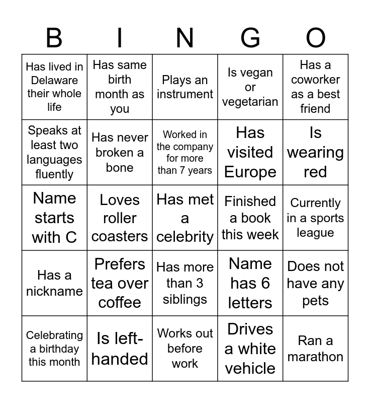 This bingo card has 25 words: Prefers tea over coffee, Works out before work, Worked in the company for more than 7 years, Celebrating a birthday this month, Has a coworker as a best friend, Has lived in Delaware their whole life, Speaks at least two languages fluently, Has same birth month as you, Finished a book this week, Has more than 3 siblings, Has visited Europe, Name starts with C, Name has 6 letters, Does not have any pets, Has never broken a bone, Ran a marathon, Currently in a sports league, Plays an instrument, Is wearing red, Loves roller coasters, Has met a celebrity, Is left-handed, Has a nickname, Is vegan or vegetarian and Drives a white vehicle.