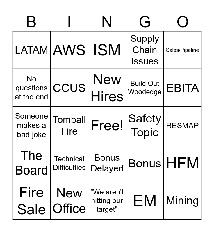 This bingo card has a free space and 24 words: Technical Difficulties, New Office, New Hires, Fire Sale, Sales/Pipeline, LATAM, No questions at the end, AWS, Safety Topic, Bonus Delayed, Build Out Woodedge, Someone makes a bad joke, Bonus, HFM, CCUS, EM, RESMAP, ISM, EBITA, Tomball Fire, Mining, The Board, Supply Chain Issues and "We aren't hitting our target".