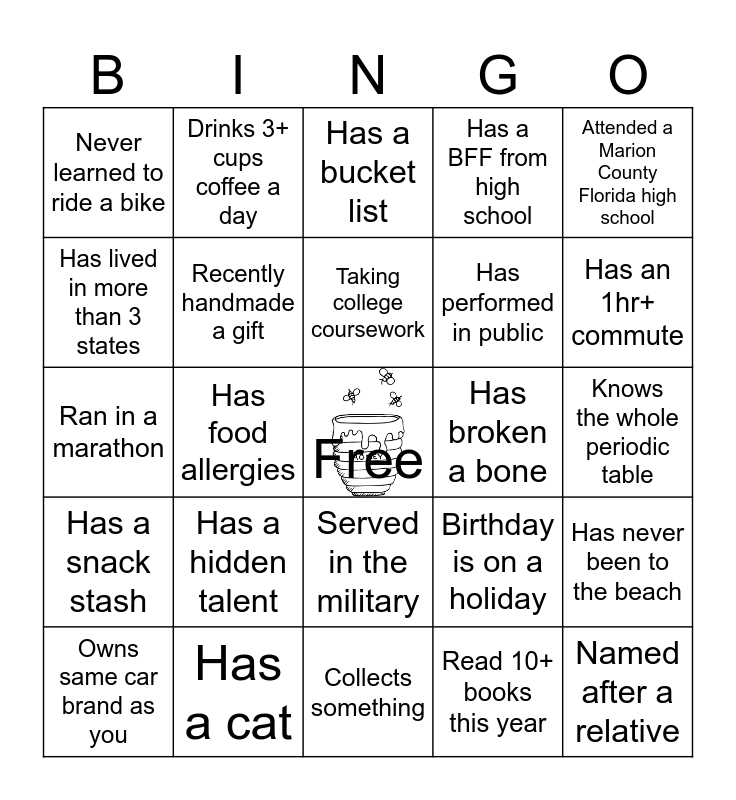 This bingo card has a free space and 57 words: Same birth month as you, Owns same car brand as you, Never flown on an airplane, Never learned to ride a bike, Collects something, Goes all-out on holiday decorating, Recently handmade a gift, Received an award, Has performed in public, Uses a paper planner, Has a BFF from high school, Fostered or adopted a child, Has worked here 10+ years, Took a how-to class, Listens to podcasts, Travels often, Attended a Marion County Florida high school, Has food allergies, Is left-handed, Named after a relative, Has broken a bone, Has a nickname, Birthday is on a holiday, Has a bucket list, Makes New Year’s resolutions, Taking college coursework, Taught a class, Had a secret admirer, Has an 1hr+ commute, Has been to every state in the U.S., Visited 4+ continents, Speaks 2+ languages, Took dance lessons, Won a contest, Knows the whole periodic table, Has lived in more than 3 states, Owns a vacation house, Ran in a marathon, Knows calligraphy, Has a snack stash, Drinks 3+ cups coffee a day, Served in the military, Played prank on a coworker, Has a favorite pen, Has 0 unread emails, Has a dog, Has a hidden talent, Has a cat, Has ridden a horse, Plays an instrument, Has a sweet tooth, Read 10+ books this year, Doesn't drink coffee, Is a good multi-tasker, Reads the old-school newspaper, Has never been to the beach and Taking college coursework.