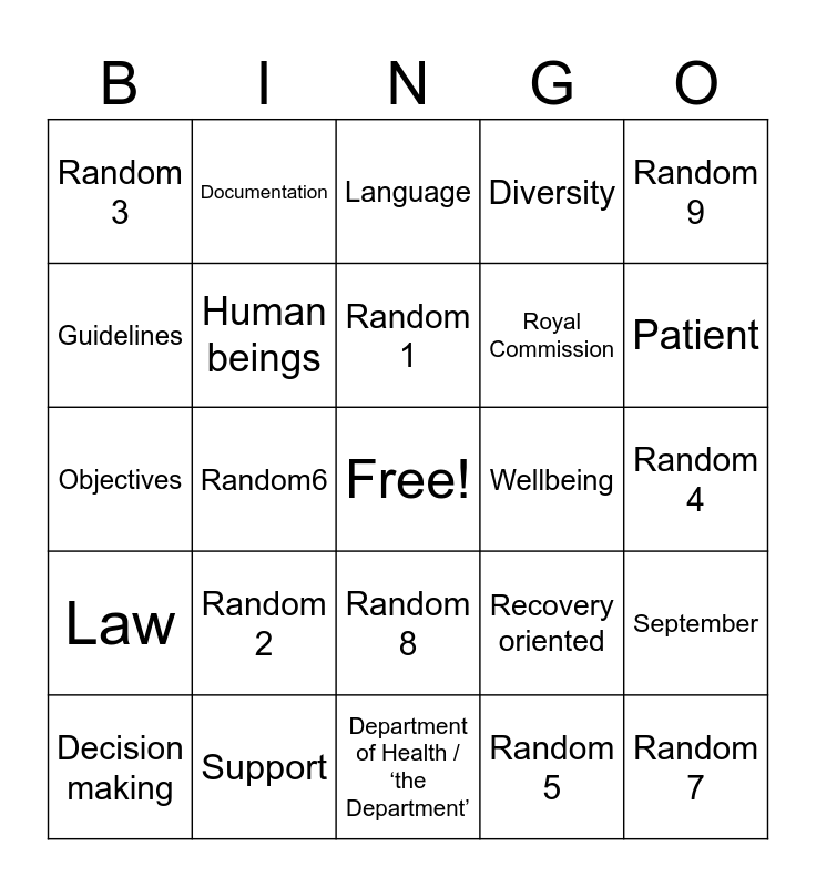 This bingo card has a free space and 27 words: Recovery oriented, Assessment, Royal Commission, Department of Health / ‘the Department’, Guidelines, Language, Documentation, Law, Wellbeing, September, Objectives, Diversity, Decision making, Support, Patient, Consumer, Human beings, Random 1, Random 2, Random 3, Random 4, Random 5, Random6, Random 7, Random 8, Random 9 and Random 10.