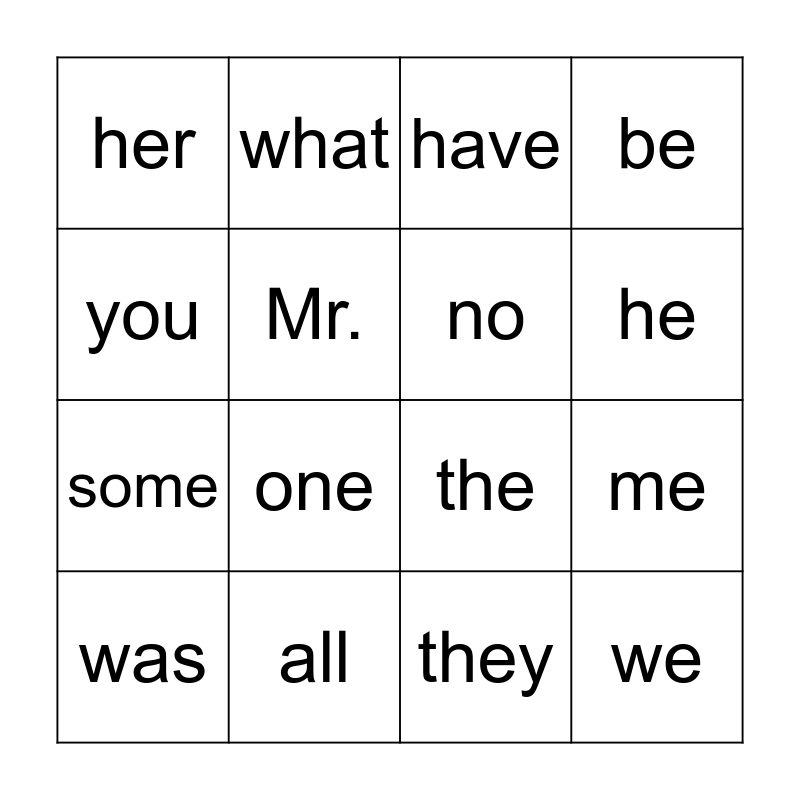 This bingo card has 41 words: I, the, to, no, go, into, he, she, you, we, me, be, was, they, all, are, my, her, said, have, like, so, do, some, come, were, there, little, one, when, out, what, oh, their, people, Mr., Mrs., looked, called, asked and could.