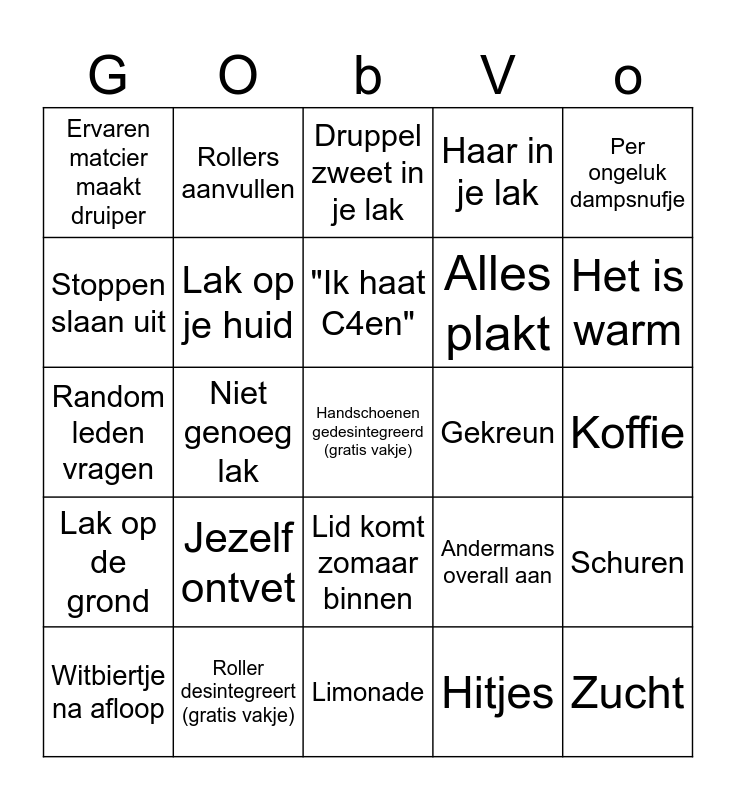 This bingo card has a free space and 30 words: Roller desintegreert (gratis vakje), "Hebben we genoeg lak?", Niet genoeg lak, MatCiesjaars maakt druiper, Ervaren matcier maakt druiper, Druppel zweet in je lak, Lak op je huid, Lid komt zomaar binnen, Gekreun, Limonade, Koffie, Zucht, Hitjes, Geblast door het loco compressorgat, Het is warm, Kleine roller al in gebruik, Andermans overall aan, Lak op de grond, Jezelf ontvet, Per ongeluk dampsnufje, Random leden vragen, Pot ontvetter staat nog open, Rollers aanvullen, Alles plakt, Stoppen slaan uit, Haar in je lak, Schuren, Witbiertje na afloop, "Ik haat C4en" and Matcier heeft een druiper.