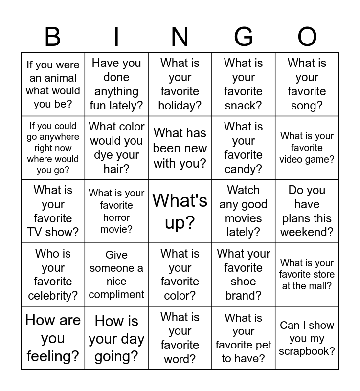 This bingo card has a free space and 24 words: Give someone a nice compliment, How is your day going?, What has been new with you?, How are you feeling?, What is your favorite song?, If you were an animal what would you be?, If you could go anywhere right now where would you go?, Have you done anything fun lately?, Watch any good movies lately?, What is your favorite color?, What is your favorite candy?, What is your favorite TV show?, What your favorite shoe brand?, What is your favorite store at the mall?, What color would you dye your hair?, What is your favorite pet to have?, Do you have plans this weekend?, What is your favorite holiday?, What is your favorite video game?, What is your favorite horror movie?, Can I show you my scrapbook?, Who is your favorite celebrity?, What is your favorite snack? and What is your favorite word?.