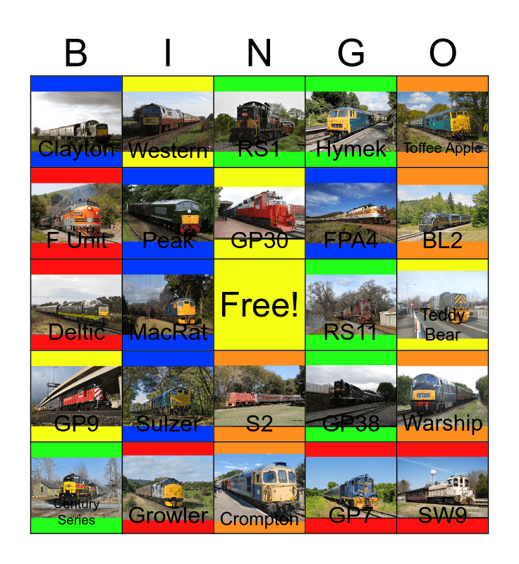 This bingo card has 24 images, a free space and 24 words: Sulzer, Growler, GP30, Century Series, Toffee Apple, Clayton, F Unit, Western, RS11, S2, FPA4, Deltic, GP38, Warship, Peak, GP7, Teddy Bear, RS1, BL2, MacRat, SW9, GP9, Hymek and Crompton.