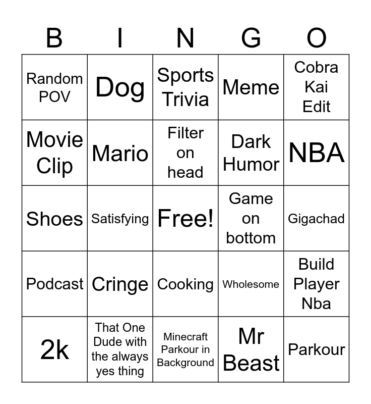 This bingo card has a free space and 24 words: Cringe, That One Dude with the always yes thing, Filter on head, 2k, Cobra Kai Edit, Random POV, Movie Clip, Dog, Game on bottom, Cooking, Dark Humor, Shoes, Wholesome, Build Player Nba, Mario, Mr Beast, Gigachad, Sports Trivia, NBA, Satisfying, Parkour, Podcast, Meme and Minecraft Parkour in Background.