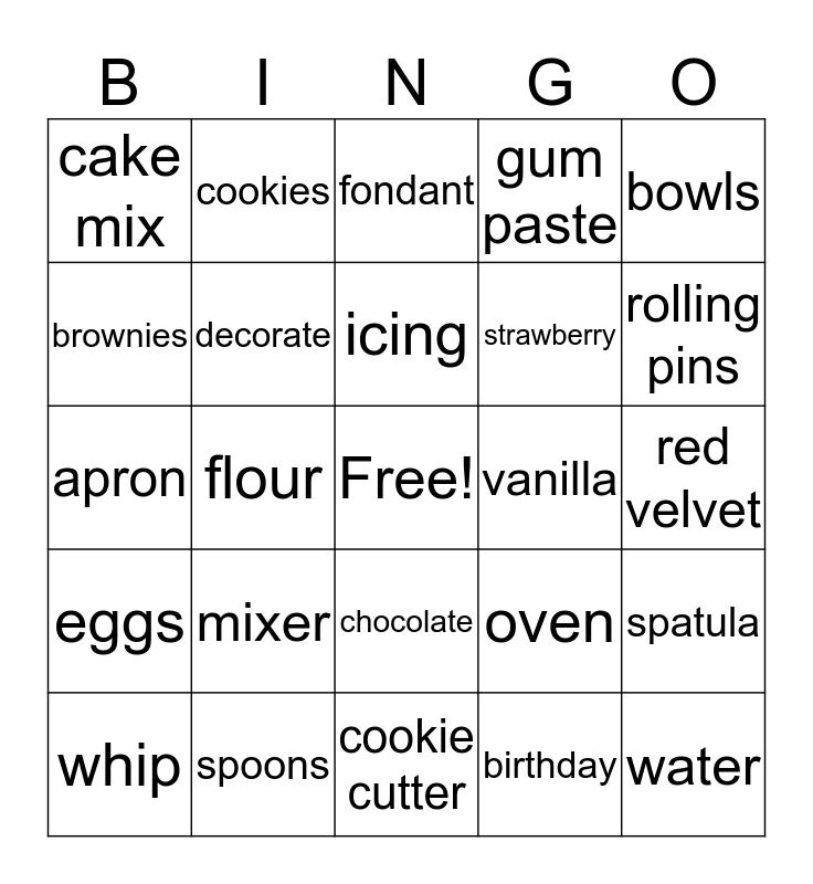 This bingo card has a free space and 24 words: mixer, spoons, icing, whip, bowls, cake mix, brownies, cookies, vanilla, chocolate, strawberry, apron, oven, spatula, decorate, birthday, red velvet, fondant, rolling pins, flour, water, eggs, gum paste and cookie cutter.