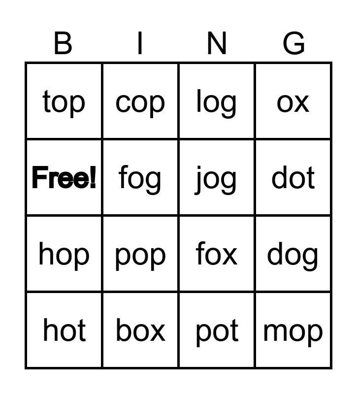 This bingo card has 16 words: box, dog, log, top, hop, cop, fox, pot, Free!, fog, hot, ox, pop, dot, jog and mop.