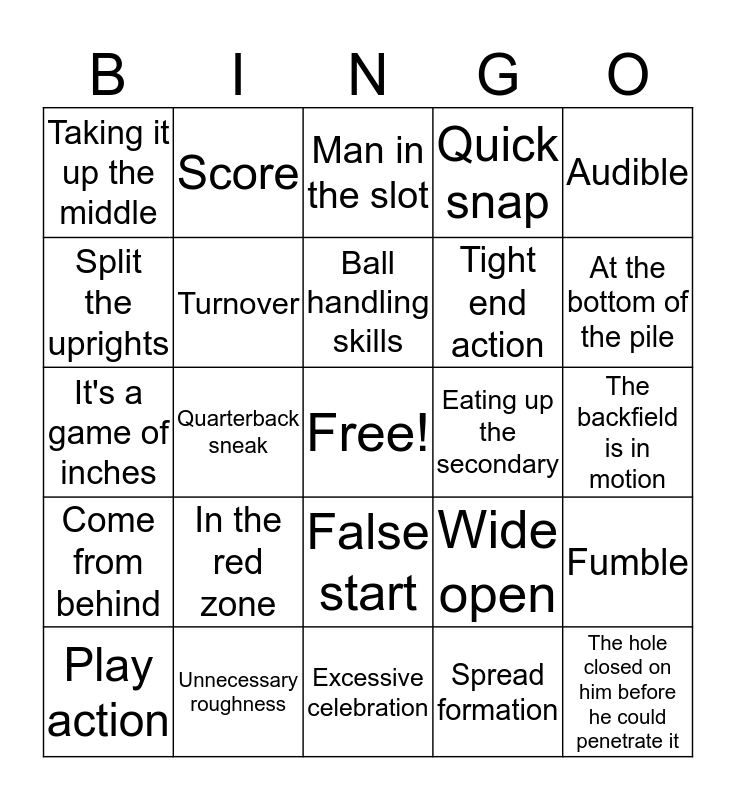 This bingo card has a free space and 24 words: In the red zone, Unnecessary roughness, Ball handling skills, Play action, Audible, Taking it up the middle, Split the uprights, Score, Eating up the secondary, False start, Tight end action, It's a game of inches, Wide open, Fumble, Turnover, Spread formation, The backfield is in motion, Man in the slot, At the bottom of the pile, Quarterback sneak, The hole closed on him before he could penetrate it, Come from behind, Quick snap and Excessive celebration.