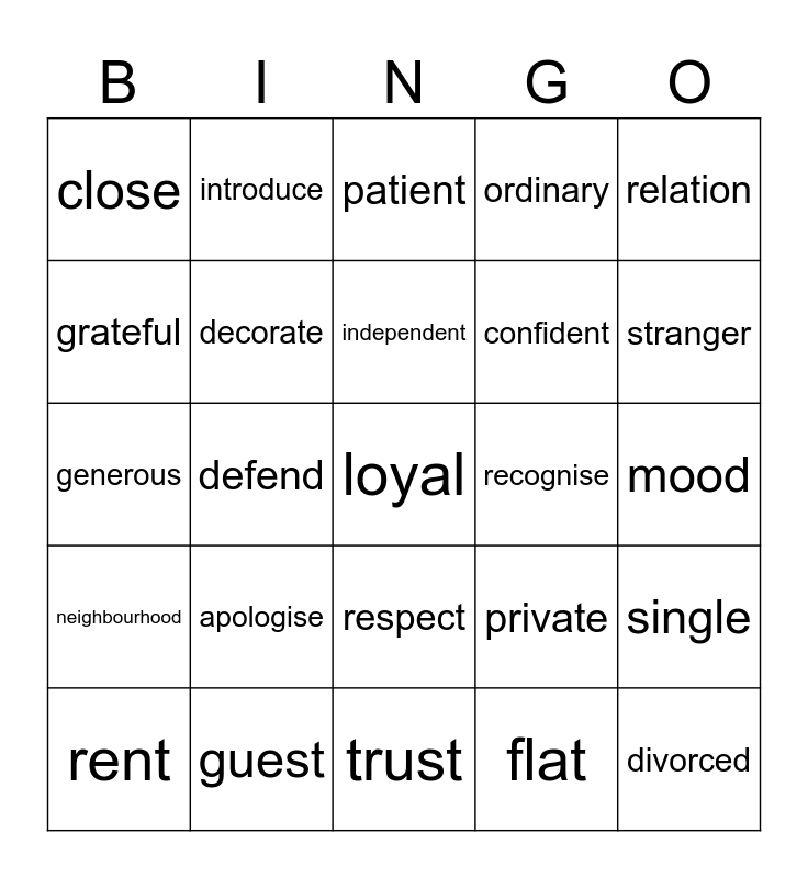 This bingo card has a free space and 24 words: apologise, guest, independent, rent, relation, close, grateful, introduce, recognise, respect, confident, generous, private, single, decorate, flat, mood, patient, stranger, defend, divorced, neighbourhood, ordinary and trust.
