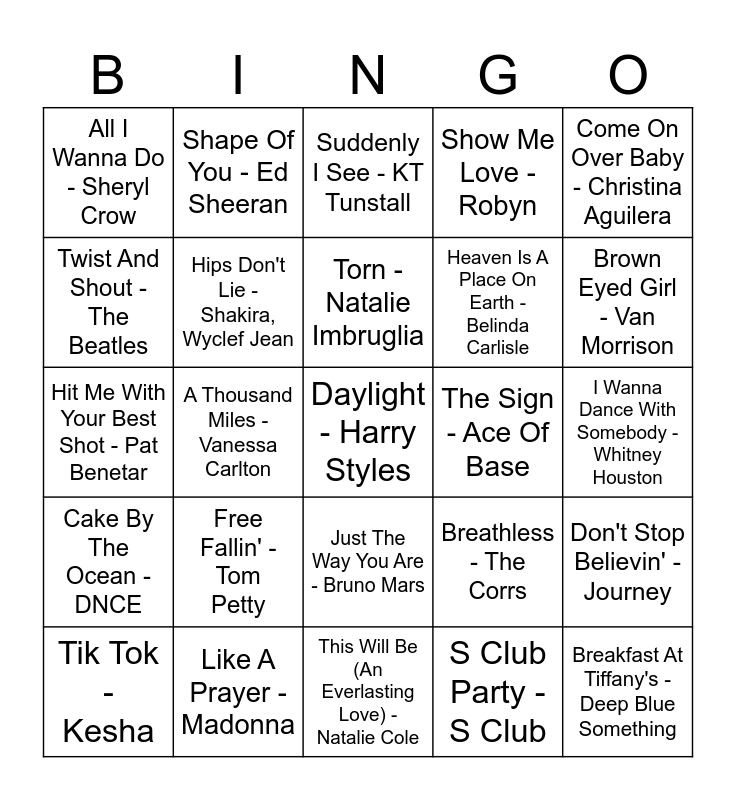 This bingo card has 100 words: 9 to 5 - Dolly Parton, Man! I Feel Like A Woman - Shania Twain, I Wanna Dance With Somebody - Whitney Houston, Wannabe - Spice Girls, Dancing Queen - Abba, Stop - Spice Girls, ... Baby One More Time - Britney Spears, Uptown Girl - Billy Joel, I'm Coming Out - Diana Ross, Don't Go Breaking My Heart - Elton John, Kiki Dee, That Don't Impress Me Much - Shania Twain, Summer Nights - Grease Cast, Respect - Aretha Franklin, Like A Prayer - Madonna, Proud Mary - Tina Turner, Bring It All Back - S Club, Heaven Is A Place On Earth - Belinda Carlisle, (I've Had) The Time Of My Life - Bill Medley, Jennifer Warnes, I'll Be There For You - The Rembrandts, The Best - Tina Turner, MMMBop - Hanson, You Can't Hurry Love - Phil Collins, C'est La Vie - B*Witched, Walking On Broken Glass - Annie Lennox, Hold On - Wilson Phillips, The Sign - Ace Of Base, Come On Over Baby - Christina Aguilera, Breathless - The Corrs, Get The Party Started - Pink, Let's Get Loud - Jennifer Lopez, A Thousand Miles - Vanessa Carlton, All I Wanna Do - Sheryl Crow, I Want It That Way - Backstreet Boys, Unwritten - Natasha Bedingfield, S Club Party - S Club, Torn - Natalie Imbruglia, Don't Stop Believin' - Journey, Life Is A Highway - Tom Cochrane, Waterfalls - TLC, Breakfast At Tiffany's - Deep Blue Something, Genie In A Bottle - Christina Aguilera, ... Since U Been Gone - Kelly Clarkson, Hit Me With Your Best Shot - Pat Benetar, Build Me Up Buttercup - The Foundations, Brown Eyed Girl - Van Morrison, Suddenly I See - KT Tunstall, Ain't No Mountain High Enough - Marvin Gaye, Tammi Terrell, Some Days You Gotta Dance - The Chicks, Love Song - Sara Bareilles, This Will Be (An Everlasting Love) - Natalie Cole, One Week - Barenaked Ladies, I Want You To Want Me - Letters to Cleo, Kiss Me - Sixpence None The Richer, Kokomo - The Beach Boys, Steal My Sunshine - LEN, Brighter Than The Sun - Colbie Caillat, There She Goes - The La's, Bette Davis Eyes - Kari Parker, Perfect Day - Hoku, Show Me Love - Robyn, Summer Sunshine - The Corrs, Summer Girls - LFO, Everywhere - Michelle Branch, Haven't Met You Yet - Michael Buble, I Don't Want To Be - Gavin DeGraw, Sk8er Boi - Avril Lavigne, It's Gonna Be Me - *NSYNC, Miss Independent - Kelly Clarkson, Jumpin' Jumpin' - Destiny's Child, Truly Madly Deeply - Savage Garden, Just A Girl - No Doubt, Free Fallin' - Tom Petty, Teenage Dirtbag - Wheatus, Shut Up and Dance - Walk The Moon, So What - P!nk, The Right Kind Of Wrong - LeAnn Rimes, Dancing In The Dark - Bruce Springsteen, Twist And Shout - The Beatles, Cruel Summer - Taylor Swift, Fearless - Taylor Swift, Sparks Fly - Taylor Swift, Daylight - Harry Styles, Can't Help Falling In Love - Ingrid Michaelson, Just The Way You Are - Bruno Mars, We Found Love - Rihanna, Calvin Harris, Shape Of You - Ed Sheeran, Sorry - Justin Bieber, Uptown Funk - Mark Ronson, Bruno Mars, Galway Girl - Ed Sheeran, Martin Jensen, Cake By The Ocean - DNCE, Last Friday Night - Katy Perry, Firework - Katy Perry, Born This Way - Lady Gaga, Tik Tok - Kesha, Hips Don't Lie - Shakira, Wyclef Jean, Story Of My Life - One Direction, Girl On Fire - Alicia Keys, Yeah! - Usher, Lil Jon, Ludacris, Love On Top - Beyonce and What I Like About You - The Romantics.