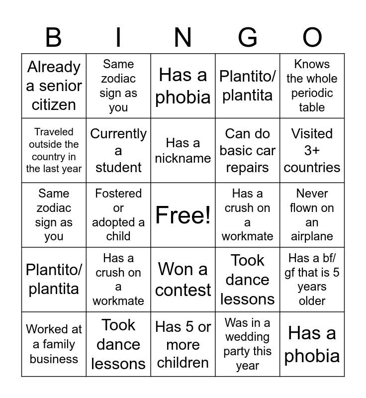 This bingo card has a free space and 73 words: Speaks 2+ languages, Knows the whole periodic table, Already a senior citizen, Taught a class, Traveled outside the country in the last year, Listens to podcasts, Plantito/ plantita, Owns same car brand as you, Took dance lessons, Has a big backyard, Visited 3+ countries, Currently a student, Currently a student, Never flown on an airplane, Climbed a mountain, Same zodiac sign as you, Has 5 or more children, Traveled outside the country in the last year, Has a birthday this month, Has a crush on a workmate, Has a nickname, Plantito/ plantita, Knows the whole periodic table, Can do basic car repairs, Worked at a family business, Had a long-distance relationship, Had a long-distance relationship, Has broken a bone, Won a contest, Has food allergies, Took dance lessons, Received a work-related award, Speaks 2+ languages, Never learned to ride a bike, Fostered or adopted a child, Worked at a family business, Listens to podcasts, Same birth month as you, Has a phobia, Already a senior citizen, Was in a wedding party this year, Has a crush on a workmate, Can bake a cake from scratch, Has a bf/ gf that is 5 years older, Has a scar, Can do basic car repairs, Has a phobia, Has 5 or more children, Got into a vehicular accident, Same zodiac sign as you, Has food allergies, Got into a vehicular accident, Has a scar, Moved residence in the past year, Has a birthday this month, Has broken a bone, Taught a class, Won a contest, Owns same car brand as you, Can bake a cake from scratch, Never learned to ride a bike, Collects something, Has performed on a stage, Visited 3+ countries, Has a nickname, Was in a wedding party this year, Has performed on a stage, Collects something, Has a bf/ gf that is 5 years older, Fostered or adopted a child, Invests in the stock market, Received a work-related award and Never flown on an airplane.