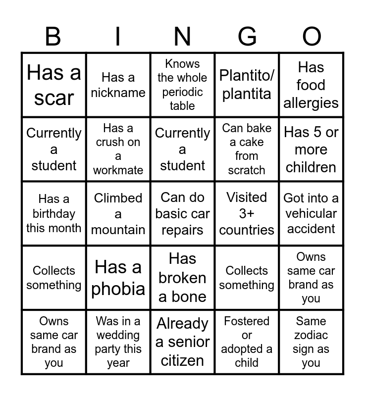 This bingo card has 74 words: Free!, Speaks 2+ languages, Knows the whole periodic table, Already a senior citizen, Taught a class, Traveled outside the country in the last year, Listens to podcasts, Plantito/ plantita, Owns same car brand as you, Took dance lessons, Has a big backyard, Visited 3+ countries, Currently a student, Currently a student, Never flown on an airplane, Climbed a mountain, Same zodiac sign as you, Has 5 or more children, Traveled outside the country in the last year, Has a birthday this month, Has a crush on a workmate, Has a nickname, Plantito/ plantita, Knows the whole periodic table, Can do basic car repairs, Worked at a family business, Had a long-distance relationship, Had a long-distance relationship, Has broken a bone, Won a contest, Has food allergies, Took dance lessons, Received a work-related award, Speaks 2+ languages, Never learned to ride a bike, Fostered or adopted a child, Worked at a family business, Listens to podcasts, Same birth month as you, Has a phobia, Already a senior citizen, Was in a wedding party this year, Has a crush on a workmate, Can bake a cake from scratch, Has a bf/ gf that is 5 years older, Has a scar, Can do basic car repairs, Has a phobia, Has 5 or more children, Got into a vehicular accident, Same zodiac sign as you, Has food allergies, Got into a vehicular accident, Has a scar, Moved residence in the past year, Has a birthday this month, Has broken a bone, Taught a class, Won a contest, Owns same car brand as you, Can bake a cake from scratch, Never learned to ride a bike, Collects something, Has performed on a stage, Visited 3+ countries, Has a nickname, Was in a wedding party this year, Has performed on a stage, Collects something, Has a bf/ gf that is 5 years older, Fostered or adopted a child, Invests in the stock market, Received a work-related award and Never flown on an airplane.