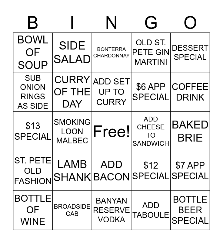 This bingo card has a free space and 24 words: LAMB SHANK, BROADSIDE CAB, ADD SET UP TO CURRY, BOTTLE OF WINE, DESSERT SPECIAL, BOWL OF SOUP, SUB ONION RINGS AS SIDE, SIDE SALAD, ADD CHEESE TO SANDWICH, ADD BACON, $6 APP SPECIAL, $13 SPECIAL, $12 SPECIAL, $7 APP SPECIAL, CURRY OF THE DAY, ADD TABOULE, BAKED BRIE, BONTERRA CHARDONNAY, COFFEE DRINK, SMOKING LOON MALBEC, BOTTLE BEER SPECIAL, ST. PETE OLD FASHION, OLD ST. PETE GIN MARTINI and BANYAN RESERVE VODKA.
