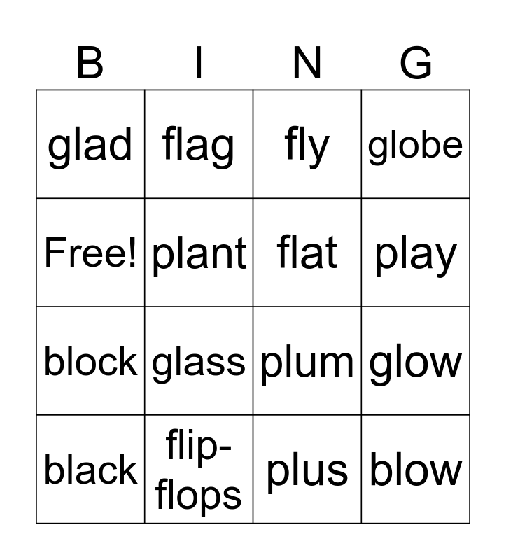 This bingo card has 16 words: flip-flops, glow, fly, glad, block, flag, plum, plus, Free!, plant, black, globe, glass, play, flat and blow.
