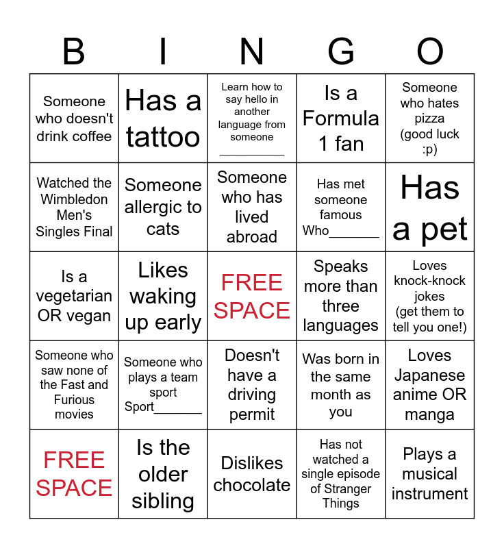 This bingo card has a free space and 24 words: Someone who plays a team sport Sport_______, Is the older sibling, Someone who has lived abroad, FREE SPACE, Someone who hates pizza (good luck :p), Someone who doesn't drink coffee, Watched the Wimbledon Men's Singles Final, Has a tattoo, Speaks more than three languages, Doesn't have a driving permit, Has met someone famous Who_______, Is a vegetarian OR vegan, Was born in the same month as you, Loves Japanese anime OR manga, Someone allergic to cats, Has not watched a single episode of Stranger Things, Loves knock-knock jokes (get them to tell you one!), Learn how to say hello in another language from someone ___________, Has a pet, Likes waking up early, Plays a musical instrument, Someone who saw none of the Fast and Furious movies, Is a Formula 1 fan and Dislikes chocolate.