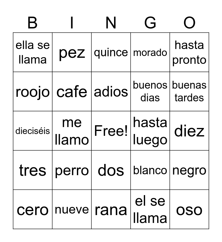 This bingo card has a free space and 47 words: pato, oso, caballo, rana, perro, gato, pez, oveja, roojo, verde, cafe, morado, negro, blanco, azul, hola, adios, hasta luego, mucho gusto, hasta pronto, me llamo, el se llama, ella se llama, buenos dias, buenas noches, buenas tardes, cero, uno, dos, tres, cuatro, cinco, seis, siete, ocho, nueve, diez, once, doce, trece, catorce, quince, dieciséis, diecisiete, dieciocho, diecinueve and veinte.