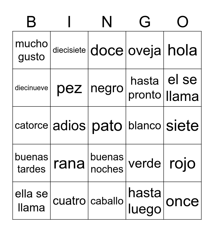 This bingo card has 48 words: Free!, pato, oso, caballo, rana, perro, diecisiete, dieciocho, diecinueve, gato, pez, oveja, rojo, verde, cafe, morado, negro, blanco, azul, hola, adios, hasta luego, mucho gusto, hasta pronto, me llamo, el se llama, ella se llama, buenos dias, buenas noches, buenas tardes, cero, uno, dos, tres, cuatro, cinco, seis, siete, ocho, nueve, diez, once, doce, trece, catorce, quince, dieciséis and veinte.