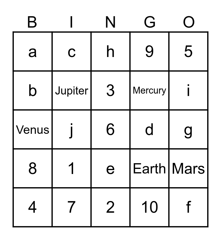 This bingo card has 25 words: 1, 2, 3, 4, 5, a, b, c, d, e, Mercury, Venus, Earth, Mars, Jupiter, f, g, h, i, j, 6, 7, 8, 9 and 10.
