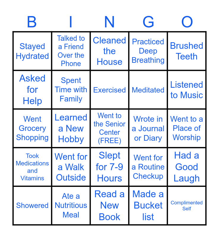 This bingo card has a free space and 24 words: Went for a Walk Outside, Ate a Nutritious Meal, Exercised, Showered, Brushed Teeth, Stayed Hydrated, Asked for Help, Talked to a Friend Over the Phone, Wrote in a Journal or Diary, Slept for 7-9 Hours, Meditated, Went Grocery Shopping, Went for a Routine Checkup, Had a Good Laugh, Spent Time with Family, Made a Bucket list, Went to a Place of Worship, Cleaned the House, Listened to Music, Learned a New Hobby, Complimented Self, Took Medications and Vitamins, Practiced Deep Breathing and Read a New Book.