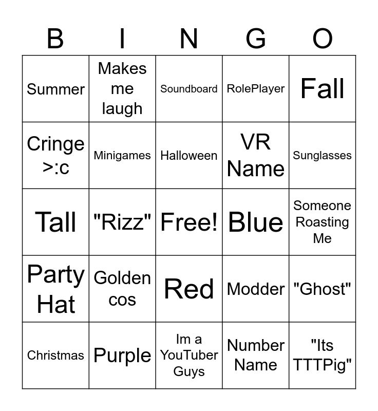 This bingo card has a free space and 24 words: Golden cos, Purple, Halloween, Christmas, Fall, Summer, Cringe >:c, Makes me laugh, Blue, Red, VR Name, Tall, Modder, "Ghost", Minigames, Number Name, Someone Roasting Me, Soundboard, Sunglasses, "Rizz", "Its TTTPig", Party Hat, RolePlayer and Im a YouTuber Guys.