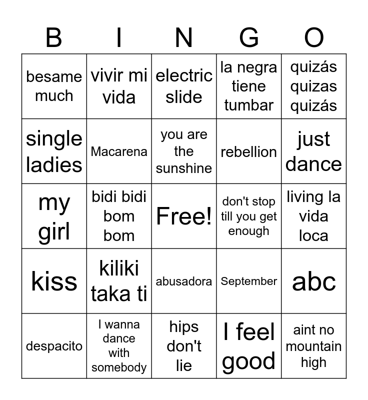 This bingo card has a free space and 24 words: kiliki taka ti, I wanna dance with somebody, you are the sunshine, despacito, quizás quizas quizás, besame much, single ladies, vivir mi vida, don't stop till you get enough, abusadora, rebellion, my girl, September, abc, Macarena, I feel good, living la vida loca, electric slide, just dance, bidi bidi bom bom, aint no mountain high, kiss, la negra tiene tumbar and hips don't lie.