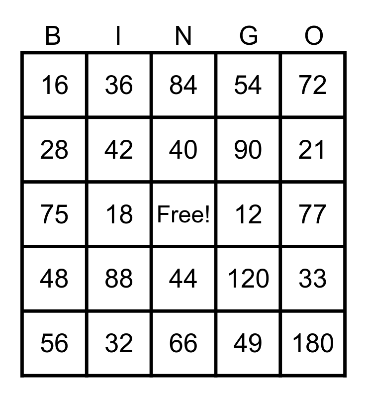 This bingo card has a free space and 24 words: 88, 32, 40, 56, 72, 16, 28, 36, 12, 44, 90, 75, 120, 33, 42, 49, 77, 84, 21, 18, 180, 48, 54 and 66.