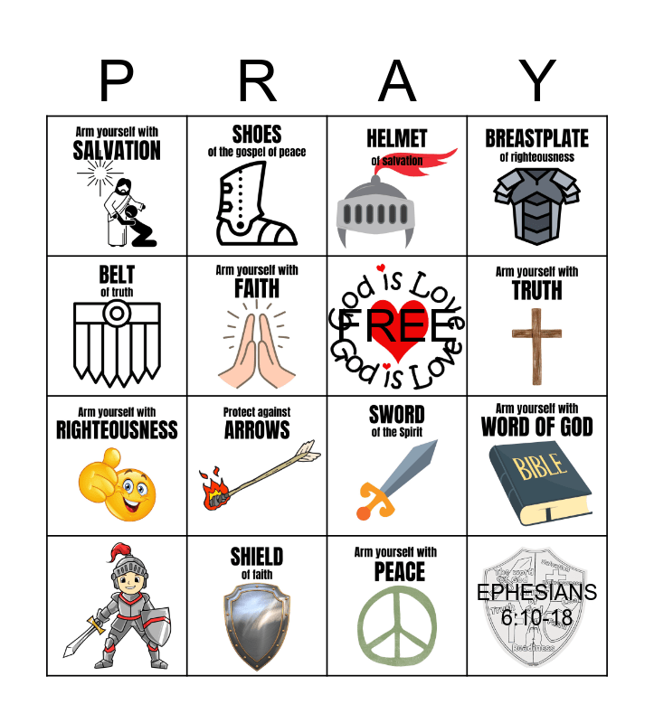 This bingo card has 16 images and 2 words: FREE and EPHESIANS 6:10-18.
