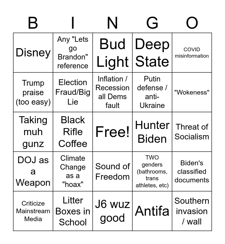 This bingo card has a free space and 30 words: Litter Boxes in School, Ultra Right Beer, Black Rifle Coffee, InfoWars Apparel, Disney, Bud Light, Election Fraud/Big Lie, Sound of Freedom, Hunter Biden, J6 wuz good, Threat of Socialism, Southern invasion / wall, Antifa, Random trafficking myth, "Wokeness", Public education grooming / CRT, TWO genders (bathrooms, trans athletes, etc), DOJ as a Weapon, Climate Change as a "hoax", COVID misinformation, Taking muh gunz, Making the libs cry, Any "Lets go Brandon" reference, Putin defense / anti-Ukraine, Trump praise (too easy), Deep State, Biden's classified documents, Criticize Mainstream Media, Inflation / Recession all Dems fault and Praise for Jason Aldean's Song.
