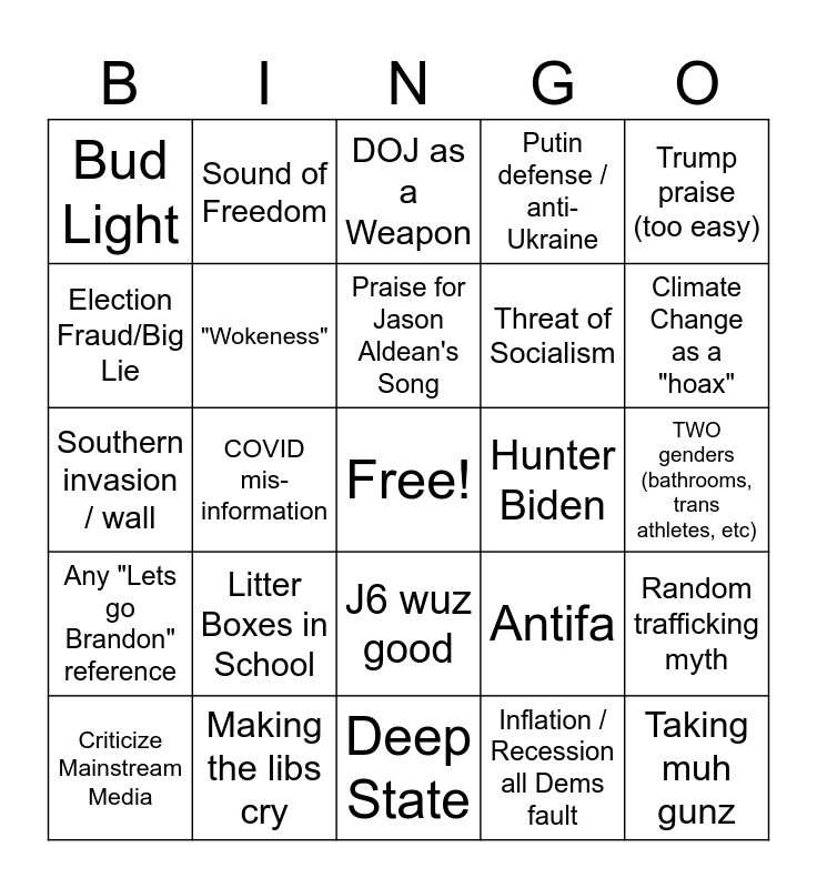 This bingo card has a free space and 25 words: Litter Boxes in School, Deep State, Praise for Jason Aldean's Song, Criticize Mainstream Media, Trump praise (too easy), Bud Light, Election Fraud/Big Lie, Sound of Freedom, Hunter Biden, J6 wuz good, Threat of Socialism, Southern invasion / wall, Antifa, Random trafficking myth, "Wokeness", Public education grooming / CRT, TWO genders (bathrooms, trans athletes, etc), DOJ as a Weapon, Climate Change as a "hoax", COVID mis-information, Taking muh gunz, Making the libs cry, Any "Lets go Brandon" reference, Putin defense / anti-Ukraine and Inflation / Recession all Dems fault.