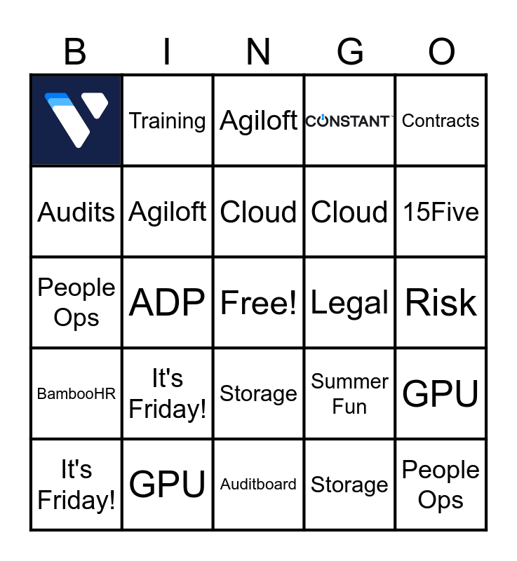 This bingo card has 2 images, a free space and 38 words: GRC, People Ops, Contracts & Sourcing, Agiloft, GPU, Storage, Cloud, Audits, Contracts, BambooHR, ADP, People Ops, Risk, Legal, It's Friday!, GRC, Contracts & Sourcing, Agiloft, GPU, Storage, Cloud, Audits, Contracts, BambooHR, ADP, Constant, Vultr, Risk, Legal, It's Friday!, Kubernetes, Summer Fun, 15Five, Auditboard, Phish, KnowBe4, Training and Mattermost.