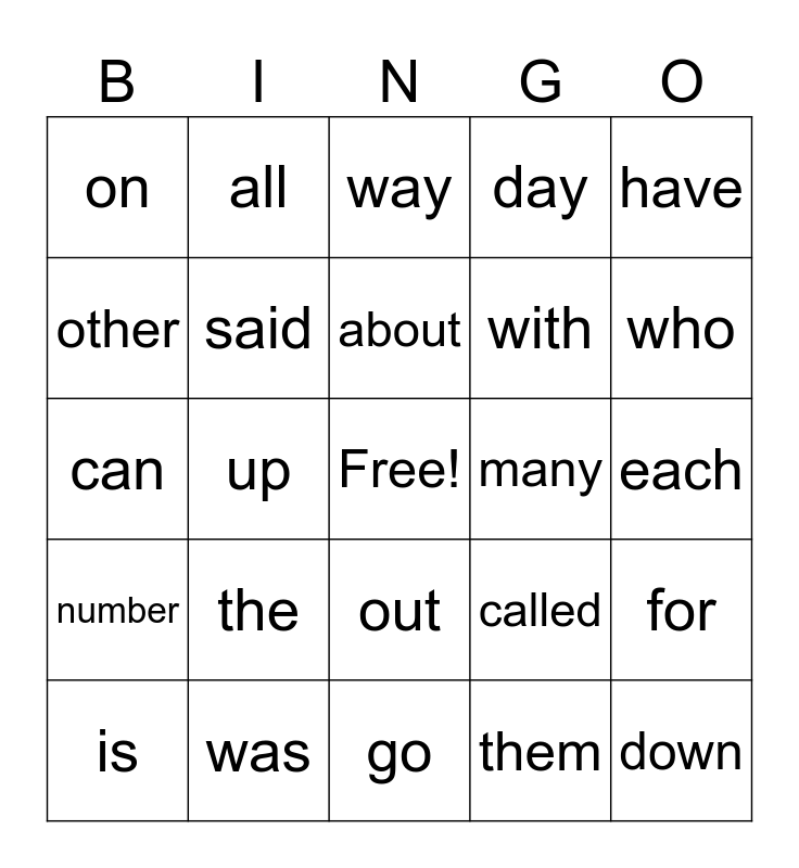 This bingo card has a free space and 24 words: the, was, about, is, have, on, other, all, many, out, with, can, called, for, said, them, each, way, who, up, down, number, day and go.