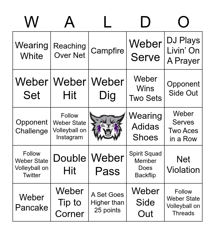 This bingo card has a free space and 35 words: Weber Ace, Weber Wins a Set, Weber Kill, Weber Hit, Weber Pass, Weber Serve, Weber Set, Weber Block, Weber Dig, Weber Challenge Won, Opponent Challenge, DJ Plays Livin’ On A Prayer, Wearing Weber State Gear, Wearing Purple, Wearing White, Wearing Adidas Shoes, Weber Side Out, Follow Weber State Volleyball on Instagram, Follow Weber State Volleyball on Twitter, Follow Weber State Volleyball on Threads, Spirit Squad Member Does Backflip, Weber Pancake, Net Violation, Weber Tip to Corner, Campfire, Opponent Side Out, Free Ball, Opponent Misses Serve, Weber Wins Two Sets, Weber Serves Two Aces in a Row, Weber Scores Three Consecutive Points, A Set Goes Higher than 25 points, Double Hit, Reaching Over Net and Match Goes to Five Sets.