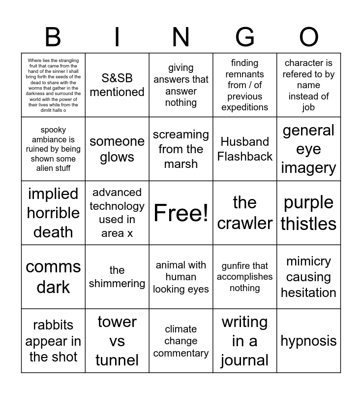 This bingo card has a free space and 24 words: the shimmering, tower vs tunnel, screaming from the marsh, rabbits appear in the shot, character is refered to by name instead of job, Where lies the strangling fruit that came from the hand of the sinner I shall bring forth the seeds of the dead to share with the worms that gather in the darkness and surround the world with the power of their lives while from the dimlit halls o, spooky ambiance is ruined by being shown some alien stuff, S&SB mentioned, the crawler, animal with human looking eyes, Husband Flashback, implied horrible death, gunfire that accomplishes nothing, mimicry causing hesitation, someone glows, writing in a journal, purple thistles, giving answers that answer nothing, general eye imagery, advanced technology used in area x, hypnosis, comms dark, finding remnants from / of previous expeditions and climate change commentary.