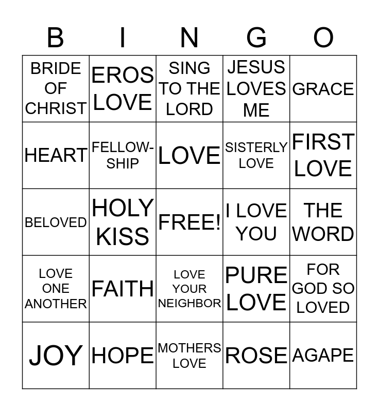 This bingo card has a free space and 24 words: FAITH, HOPE, LOVE, JOY, GRACE, BRIDE OF CHRIST, HEART, EROS LOVE, I LOVE YOU, LOVE YOUR NEIGHBOR, SISTERLY LOVE, BELOVED, PURE LOVE, FOR GOD SO LOVED, FELLOW-SHIP, ROSE, THE WORD, SING TO THE LORD, FIRST LOVE, HOLY KISS, AGAPE, LOVE ONE ANOTHER, JESUS LOVES ME and MOTHERS LOVE.