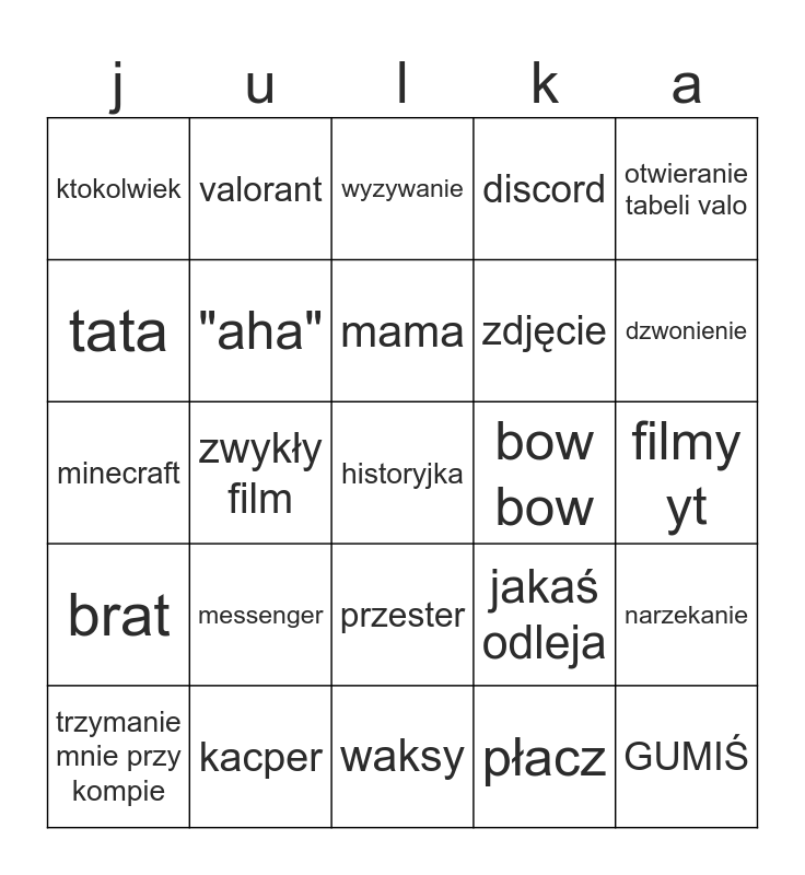 This bingo card has a free space and 24 words: messenger, kacper, mama, trzymanie mnie przy kompie, otwieranie tabeli valo, ktokolwiek, tata, valorant, bow bow, przester, zdjęcie, minecraft, jakaś odleja, narzekanie, "aha", płacz, filmy yt, wyzywanie, dzwonienie, zwykły film, GUMIŚ, brat, discord and waksy.