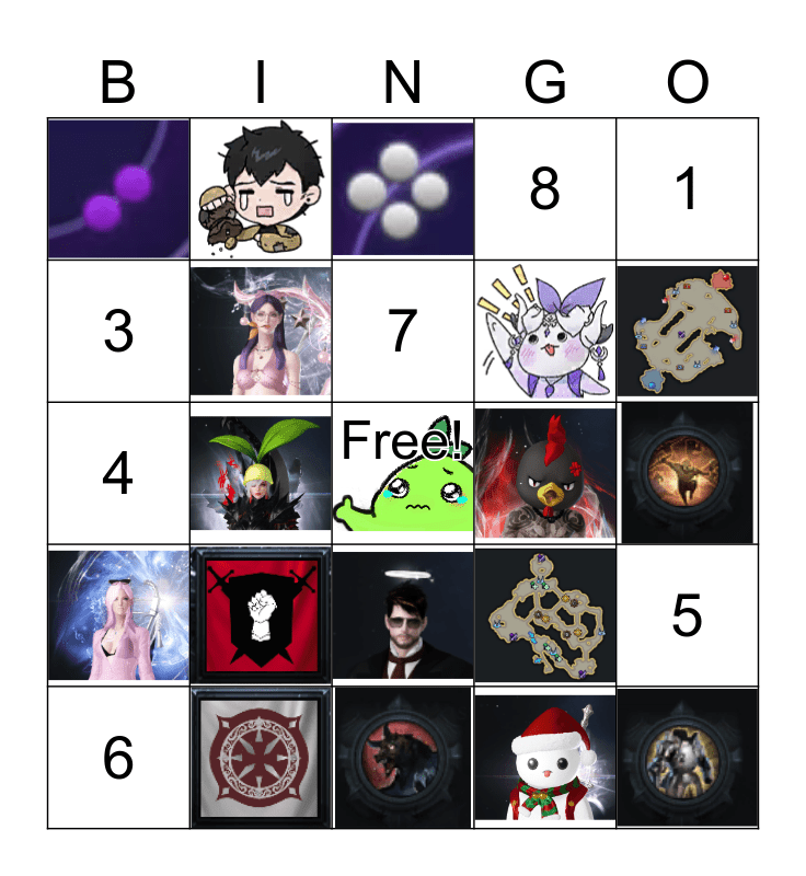 This bingo card has 22 images, a free space and 8 words: 1, 4, 3, 8, 5, 6, 7 and 2.