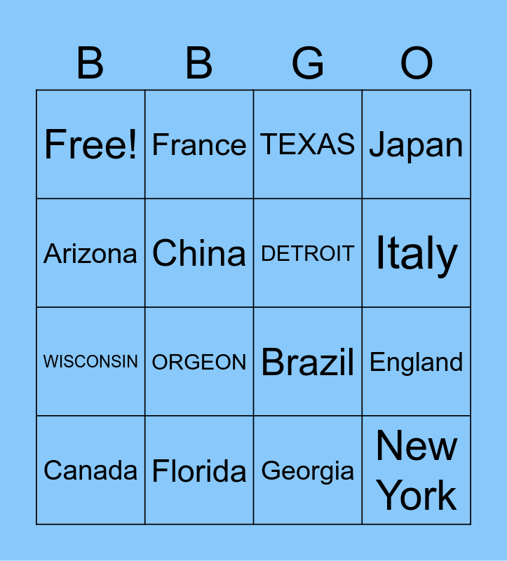 This bingo card has 16 words: Canada, Florida, TEXAS, Japan, Arizona, France, Brazil, England, Free!, China, Georgia, Italy, WISCONSIN, ORGEON, DETROIT and New York.