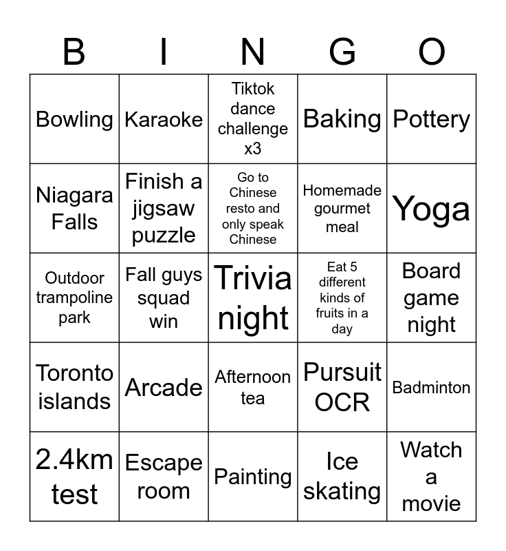 This bingo card has 25 words: Arcade, Painting, Go to Chinese resto and only speak Chinese, 2.4km test, Pottery, Bowling, Niagara Falls, Karaoke, Eat 5 different kinds of fruits in a day, Afternoon tea, Homemade gourmet meal, Outdoor trampoline park, Pursuit OCR, Badminton, Finish a jigsaw puzzle, Watch a movie, Board game night, Tiktok dance challenge x3, Yoga, Fall guys squad win, Trivia night, Escape room, Toronto islands, Baking and Ice skating.