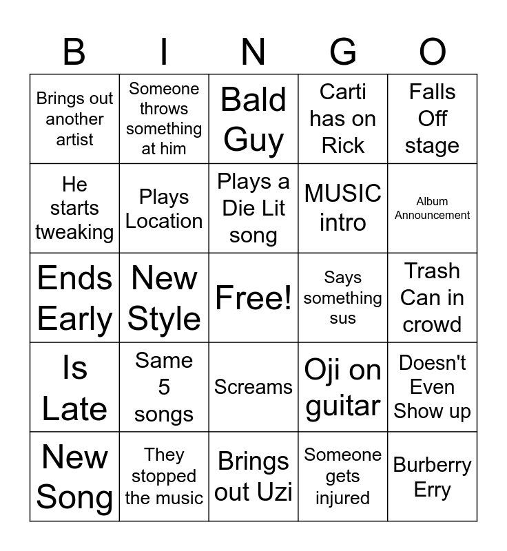 This bingo card has a free space and 24 words: New Song, Same 5 songs, Plays a Die Lit song, Someone gets injured, Falls Off stage, Brings out another artist, Someone throws something at him, Bald Guy, Says something sus, Trash Can in crowd, Ends Early, Plays Location, Oji on guitar, Doesn't Even Show up, He starts tweaking, They stopped the music, Brings out Uzi, Carti has on Rick, Album Announcement, Is Late, New Style, Screams, MUSIC intro and Burberry Erry.