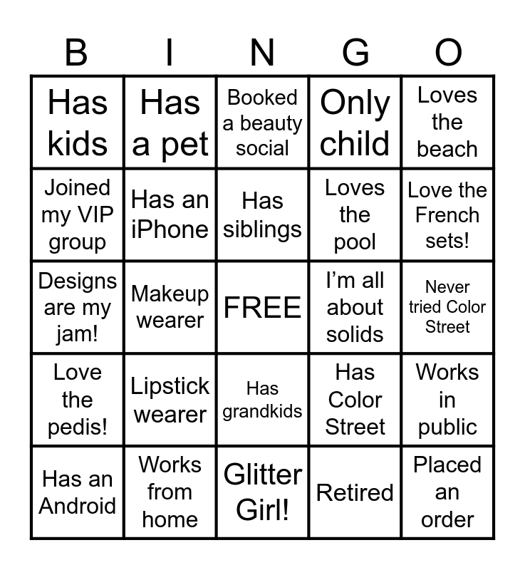 This bingo card has a free space and 24 words: Has an Android, Lipstick wearer, Has siblings, Retired, Loves the beach, Has kids, Has a pet, Booked a beauty social, I’m all about solids, Never tried Color Street, Designs are my jam!, Has an iPhone, Has Color Street, Works in public, Joined my VIP group, Works from home, Glitter Girl!, Only child, Love the French sets!, Love the pedis!, Makeup wearer, Has grandkids, Loves the pool and Placed an order.