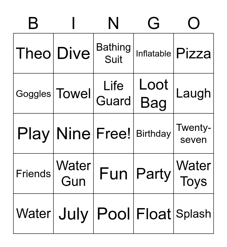 This bingo card has a free space and 29 words: Water, Swim, Nine, Cake, Theo, Bathing Suit, Towel, Water Gun, Birthday, July, Twenty-seven, Splash, Pool, Float, Laugh, Summer, Fun, Friends, Pizza, Play, Party, Happy, Loot Bag, Goggles, Inflatable, Dive, Water Toys, Life Guard and Community Centre.