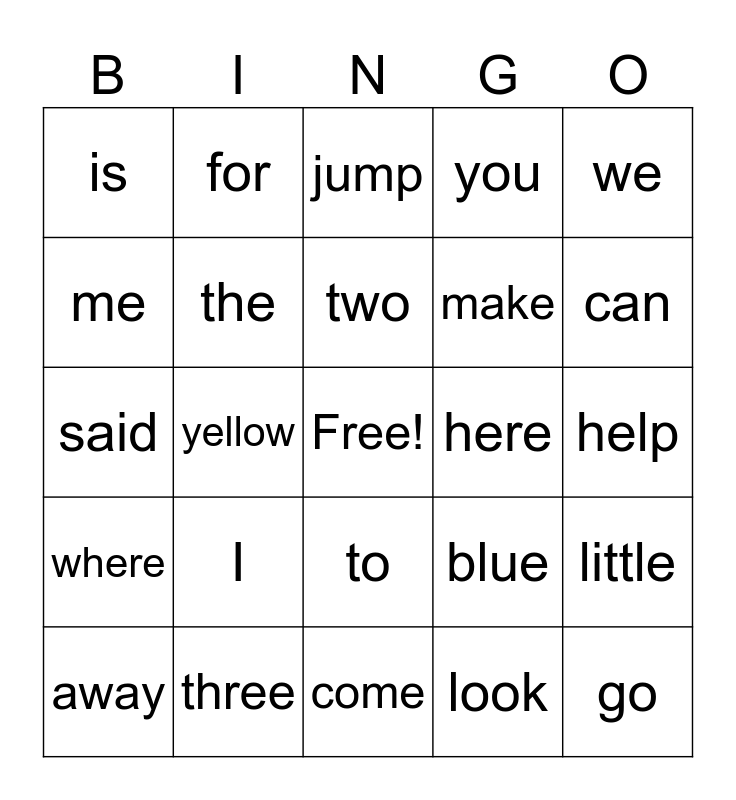This bingo card has a free space and 40 words: run, said, see, the, three, to, two, up, we, where, yellow, you, go, help, here, I, in, is, it, jump, little, look, make, me, my, not, one, play, red, a, and, away, big, blue, can, come, down, find, for and funny.