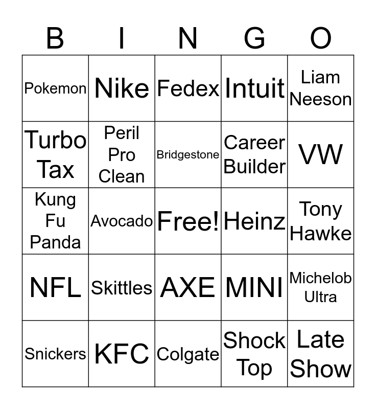 This bingo card has a free space and 24 words: Skittles, KFC, Bridgestone, Snickers, Liam Neeson, Pokemon, Turbo Tax, Nike, Heinz, AXE, Career Builder, Kung Fu Panda, MINI, Michelob Ultra, Peril Pro Clean, Shock Top, Tony Hawke, Fedex, VW, Avocado, Late Show, NFL, Intuit and Colgate.