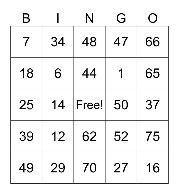 This bingo card has a free space and 24 words: 12, 29, 44, 49, 66, 7, 18, 34, 50, 62, 1, 25, 52, 75, 6, 27, 37, 48, 65, 14, 16, 39, 47 and 70.
