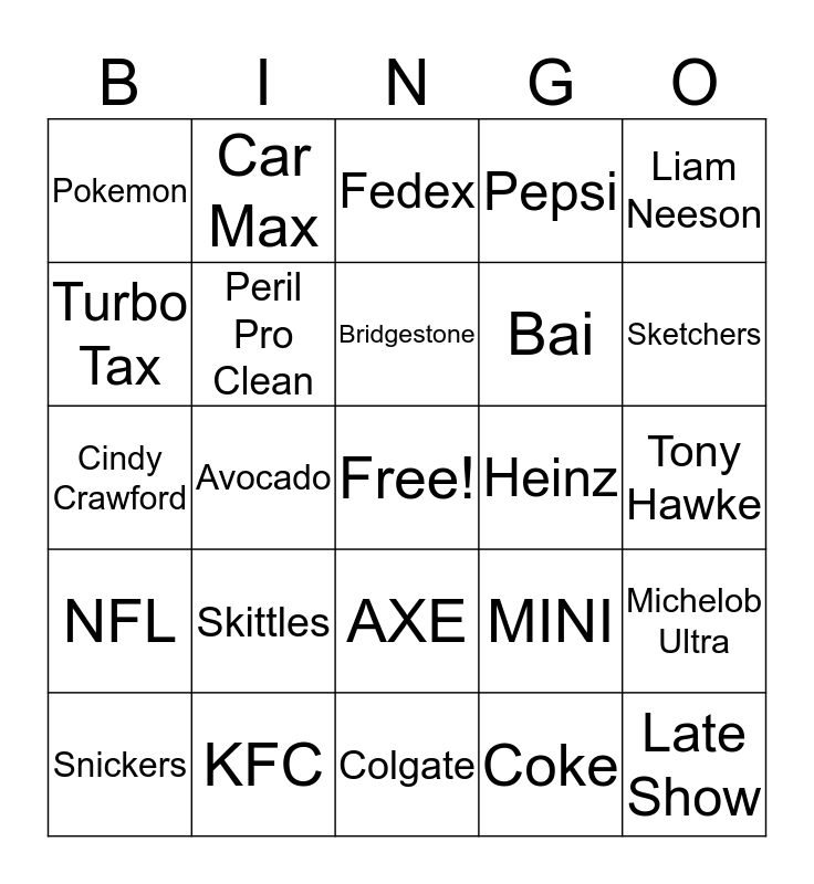 This bingo card has a free space and 24 words: Skittles, KFC, Bridgestone, Snickers, Liam Neeson, Pokemon, Turbo Tax, Car Max, Heinz, AXE, Bai, Cindy Crawford, MINI, Michelob Ultra, Peril Pro Clean, Coke, Tony Hawke, Fedex, Sketchers, Avocado, Late Show, NFL, Pepsi and Colgate.