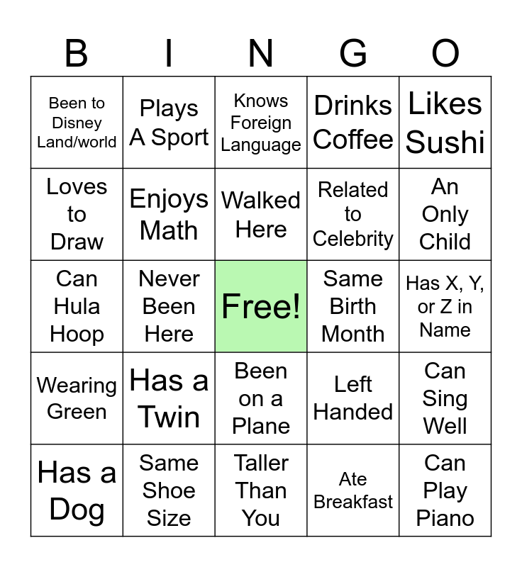 This bingo card has a free space and 24 words: Has a Twin, Same Shoe Size, Walked Here, Has a Dog, Likes Sushi, Been to Disney Land/world, Loves to Draw, Plays A Sport, Same Birth Month, Been on a Plane, Related to Celebrity, Can Hula Hoop, Left Handed, Can Sing Well, Enjoys Math, Ate Breakfast, Has X, Y, or Z in Name, Knows Foreign Language, An Only Child, Never Been Here, Can Play Piano, Wearing Green, Drinks Coffee and Taller Than You.