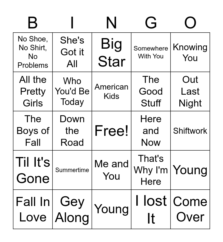 This bingo card has a free space and 24 words: Summertime, Gey Along, American Kids, Fall In Love, Knowing You, No Shoe, No Shirt, No Problems, All the Pretty Girls, She's Got it All, Here and Now, Me and You, The Good Stuff, The Boys of Fall, That's Why I'm Here, Young, Who You'd Be Today, I lost It, Shiftwork, Big Star, Out Last Night, Down the Road, Come Over, Til It's Gone, Somewhere With You and Young.