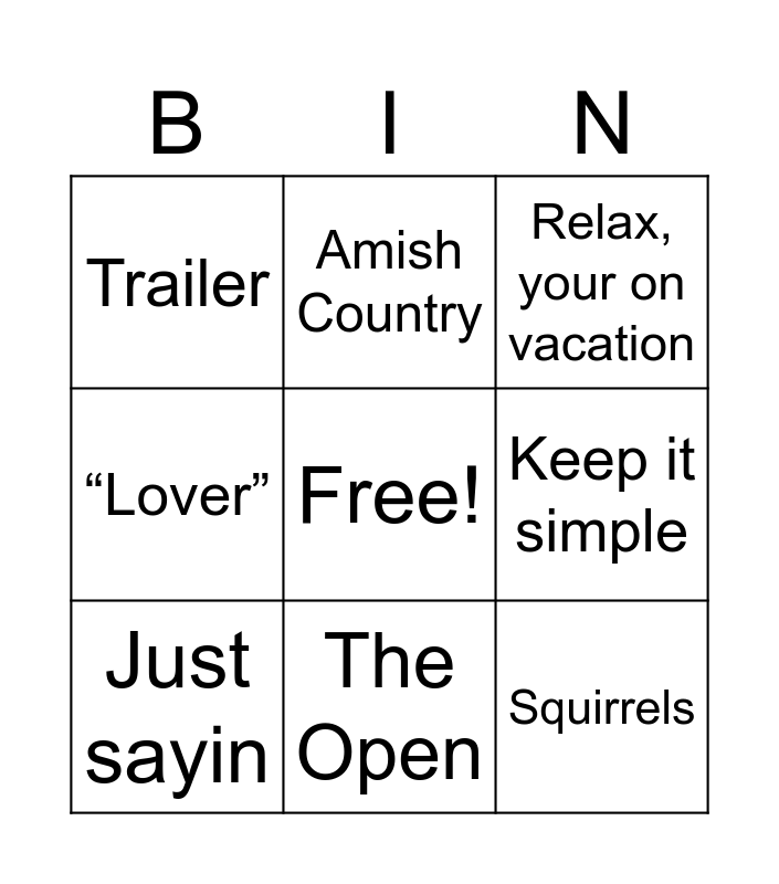 This bingo card has a free space and 8 words: Keep it simple, Relax, your on vacation, Amish Country, Just sayin, Trailer, Squirrels, “Lover” and The Open.