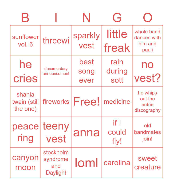 This bingo card has a free space and 24 words: teeny vest, stockholm syndrome and Daylight, best song ever, canyon moon, whole band dances with him and pauli, sunflower vol. 6, he cries, threewi, medicine, anna, rain during sott, shania twain (still the one), if I could fly!, old bandmates join!, documentary announcement, carolina, he whips out the entrie discography, sparkly vest, no vest?, fireworks, sweet creature, peace ring, little freak and loml.