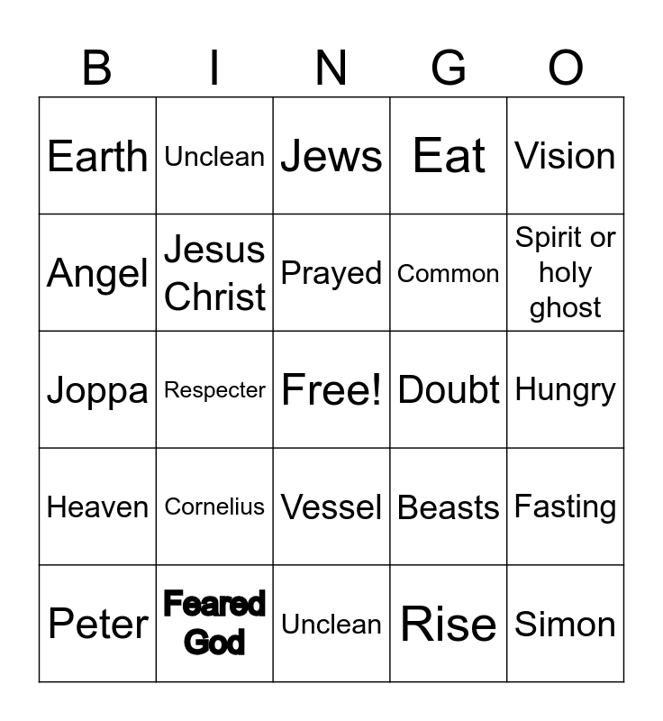 This bingo card has a free space and 24 words: Cornelius, Feared God, Prayed, Peter, Vision, Earth, Angel, Unclean, Doubt, Vessel, Common, Joppa, Beasts, Fasting, Jesus Christ, Rise, Hungry, Jews, Spirit or holy ghost, Respecter, Simon, Heaven, Eat and Unclean.